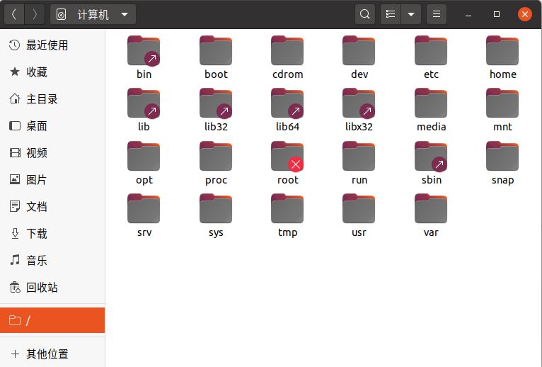 上图文件夹带箭头的是表示该文件类似于windows下的快捷方式,即该文件本身不在该目录下,而是在其他目录下,只是在该目录下作了一个软连接。上图的六个文件实际上都在usr目录下。带叉的文件属于没有权限访问的目录。